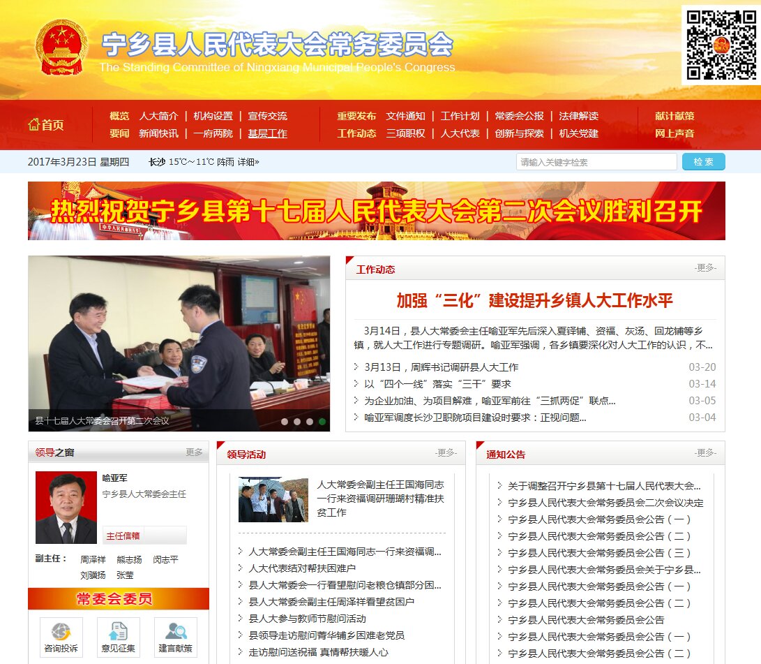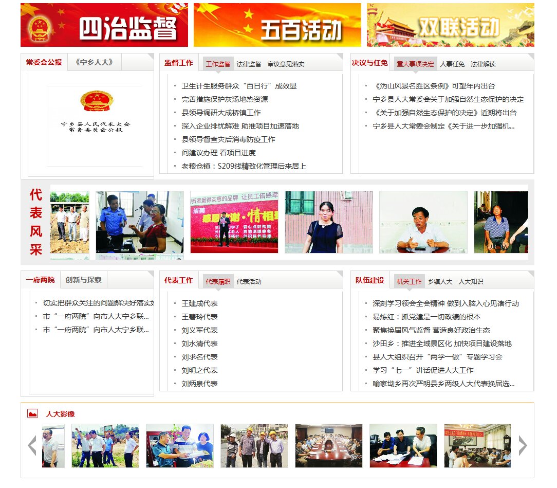 1.人大簡(jiǎn)介 寧鄉(xiāng)縣人民代表大會(huì)常務(wù)委員會(huì)是寧鄉(xiāng)縣人民代表大會(huì)的常設(shè)機(jī)關(guān),對(duì)寧鄉(xiāng)縣人民代表大會(huì)負(fù)責(zé)并報(bào)告工作。 寧鄉(xiāng)縣人大常務(wù)委員會(huì)由主任、副主任、委員組成,常務(wù)委員會(huì)的組成人員由長沙縣第十六屆人民代表大會(huì)第一次會(huì)議在代表中選舉產(chǎn)生。常務(wù)委員會(huì)每屆任期與寧鄉(xiāng)縣人民代表大會(huì)每屆任期相同。 常務(wù)委員會(huì)會(huì)議由主任召集,每兩個(gè)月至少舉行一次。常務(wù)委員會(huì)的決議,須經(jīng)常務(wù)委員會(huì)全體組成人員的過半數(shù)通過。 常務(wù)委員會(huì)行使下列職權(quán): 在本縣行政區(qū)域內(nèi),保證憲法、法律、行政法規(guī)和全國人民代表大會(huì)及其常務(wù)委員會(huì)決議的遵守和執(zhí)行。 討論決定本縣政治、經(jīng)濟(jì)、教育、科學(xué)、文化、衛(wèi)生、環(huán)境和資源保護(hù)、民政、民族工作的重大事項(xiàng);決定對(duì)本縣國民經(jīng)濟(jì)社會(huì)發(fā)展計(jì)劃和預(yù)算的部分變更。 監(jiān)督縣人民政府、縣人民法院和縣人民檢察院的工作;聯(lián)系縣人民代表大會(huì)代表,受理人民群眾對(duì)上述機(jī)關(guān)和國家工作人員的申訴和意見。 撤銷鄉(xiāng)鎮(zhèn)人民代表大會(huì)及人大主席團(tuán)的不適當(dāng)?shù)臎Q議;撤銷縣人民政府不適當(dāng)?shù)臎Q定和命令。 在寧鄉(xiāng)縣人民代表大會(huì)閉會(huì)期間,決定副縣長的個(gè)別任免;在縣長、縣人民法院院長、縣人民檢察院撿察長因故不能擔(dān)任職務(wù)的時(shí)候,決定代理人選;決定縣人民政府組成人員、縣人民法院審判人員、縣人民檢察院檢察人員的任免;在寧鄉(xiāng)縣人民代表大會(huì)閉會(huì)期間,決定撤銷個(gè)別副縣長的職務(wù);決定撤銷由它任命的縣人民政府其他組成人員和縣人民法院審判人員、縣人民檢察院檢察人員的職務(wù);在寧鄉(xiāng)縣人民代表大會(huì)閉會(huì)期間,補(bǔ)選長沙市人民代表大會(huì)出缺的代表和罷免個(gè)別代表。 常務(wù)委員會(huì)主任、副主任組成主任會(huì)議,主任會(huì)議處理常務(wù)委員會(huì)的重要日常工作。 常務(wù)委員會(huì)設(shè)立代表資格審查委員會(huì)。代表資格審查委員會(huì)的主任、副主任和委員的人選,由常務(wù)委員會(huì)主任會(huì)議在常務(wù)委員會(huì)組成人員中提名,常務(wù)委員會(huì)會(huì)議通過。代表資格審查委員會(huì)負(fù)責(zé)審查代表的選舉是否符合法律規(guī)定。 2.網(wǎng)站效果圖: |