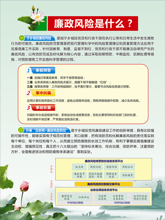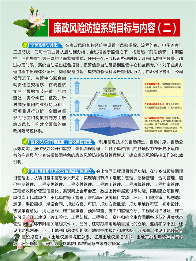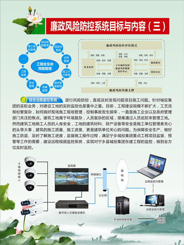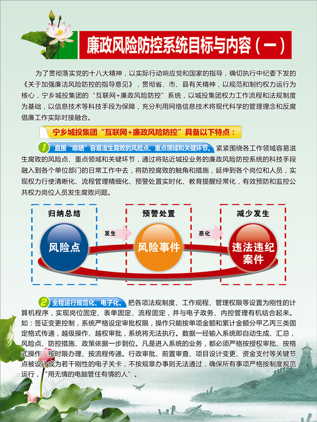 為了貫徹落實(shí)黨的十八大精神,以實(shí)際行動(dòng)響應(yīng)黨和國(guó)家的指導(dǎo),確切執(zhí)行中紀(jì)委下發(fā)的《關(guān)于加強(qiáng)廉潔風(fēng)險(xiǎn)防控的指導(dǎo)意見(jiàn)》,貫徹省、市、縣有關(guān)精神,以規(guī)范和制約權(quán)力運(yùn)行為核心,寧鄉(xiāng)城投集團(tuán)的“互聯(lián)網(wǎng)+廉政風(fēng)險(xiǎn)防控”系統(tǒng),以城投集團(tuán)權(quán)力工作流程和法規(guī)制度為基礎(chǔ),以信息技術(shù)等科技手段為保障,充分利用網(wǎng)絡(luò)信息技術(shù)將現(xiàn)代科學(xué)的管理理念和反腐倡廉工作實(shí)際對(duì)接融合。 寧鄉(xiāng)城投集團(tuán)“互聯(lián)網(wǎng)+廉政風(fēng)險(xiǎn)防控”具備以下特點(diǎn): 1、直接“晾曬”容易滋生腐敗的風(fēng)險(xiǎn)點(diǎn)、重點(diǎn)領(lǐng)域和關(guān)鍵環(huán)節(jié), 2、全程運(yùn)行規(guī)范化、電子化; 3、全面監(jiān)督實(shí)時(shí)化; 4、強(qiáng)化權(quán)力公開(kāi)和監(jiān)控,強(qiáng)化流程管理; 5、運(yùn)營(yíng)項(xiàng)目周期理論支持廉政防控建設(shè),突出協(xié)同工程項(xiàng)目管理功能; 6、結(jié)合遠(yuǎn)程監(jiān)控系統(tǒng),進(jìn)行風(fēng)險(xiǎn)防控,直觀及時(shí)發(fā)現(xiàn)問(wèn)題項(xiàng)目施工問(wèn)題。 |